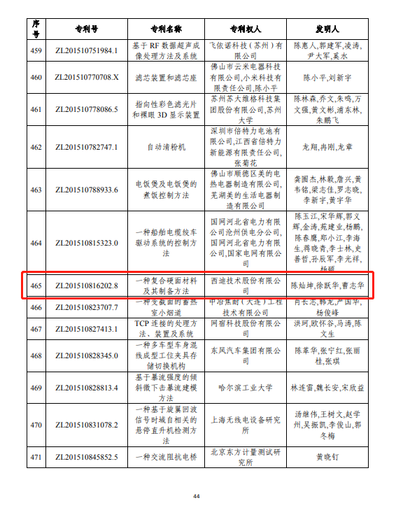 近日,國家知識產權局發布了關于第二十二屆中國專利獎評審結果公示。西迪技術股份有限公司《一種復合硬面材料及其制備方法》發明專利榮獲“第二十二屆中國專利優秀獎”。