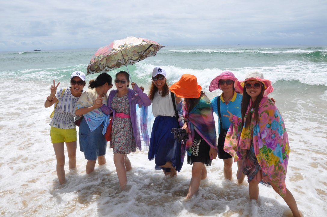 我們的女同事都披上了夏威夷風(fēng)格的海灘披巾,怕被炙熱的太陽曬傷,墨鏡、大遮沿太陽帽、太陽傘等裝備齊全。盡管毒辣的太陽也無法阻擋我們對(duì)大海的熱愛,趕緊脫掉鞋子去海水里走走,一起與大海拍照留念。