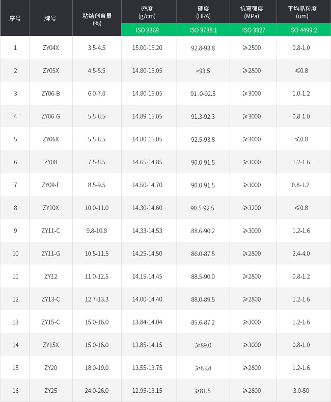 鎢鈷硬質(zhì)合金是由碳化鎢和金屬鈷組成的硬質(zhì)合金,這類合金是產(chǎn)量最大、用途最廣的一類。西迪技術(shù)股份有限公司硬質(zhì)合金牌號(hào)中也以鎢鈷類硬質(zhì)合金占比最多。其詳細(xì)性能可通過(guò)下面的牌號(hào)表可以看出,供客戶不同需求做選擇參考。