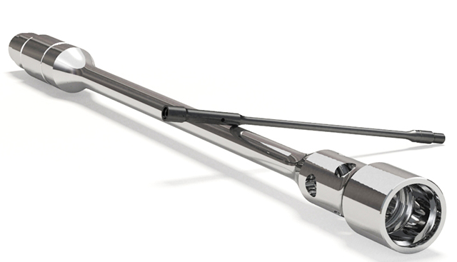 噴吸鉆外形的切削刃交錯(cuò)分布在精密零件加工鉆頭的兩側(cè),頸部有噴射切削液的小孔,前端有兩個(gè)喇叭形孔,切屑在由小孔噴射出的高壓切削液的壓力作用下,從這兩個(gè)喇叭形孔沖入并吸出空心刀桿向外排出。